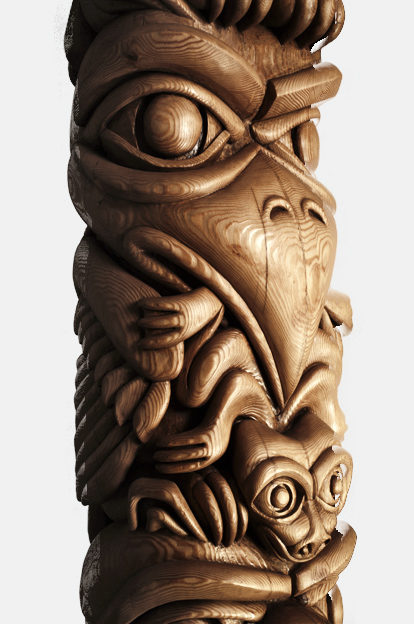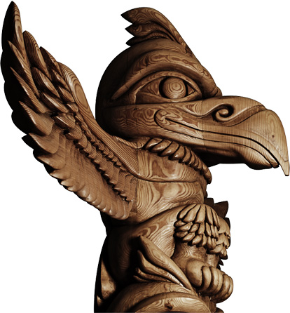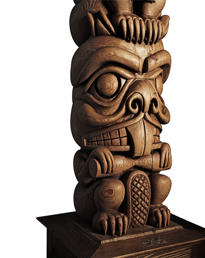 Ce mât totémique a une hauteur de 12 pieds, un diamètre de 15 pouces et une envergure d’aile de 5 pieds. La totalité du bois utilisé, du Sapin Douglas (B.C. Fir), provient d’une seule poutre de construction recyclée, âgée de plus de soixante-quinze ans. Sa conception et sa fabrication nécessitèrent des milliers d’heures de travail et de réflexion. Quant à sa finition, à l’huile, elle garantit à cette pièce une grande longévité ainsi que la possibilité de l’entretenir au besoin.