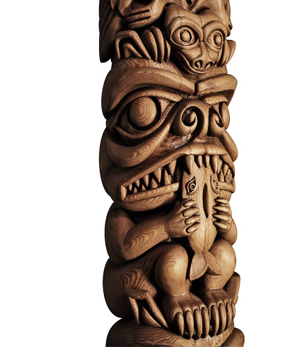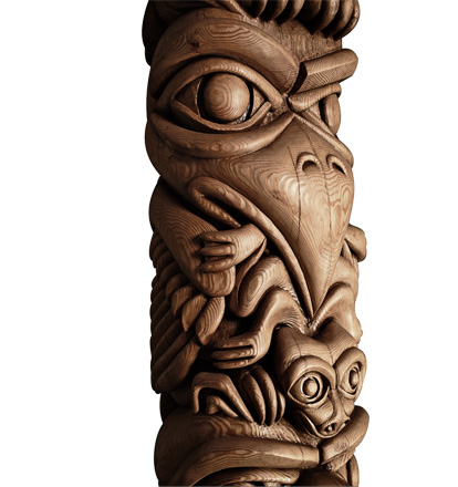 Inspirée de l’esthétique des peuples amérindiens de la côte ouest, cette œuvre est un exercice de style sur le thème de l’identité. Représentation symbolique des traits de caractère et des valeurs défendues par l’artiste, chaque animal a été choisi pour ses qualités propres, ainsi que pour marquer les nombreux et indéniables liens entre l’homme et la nature.